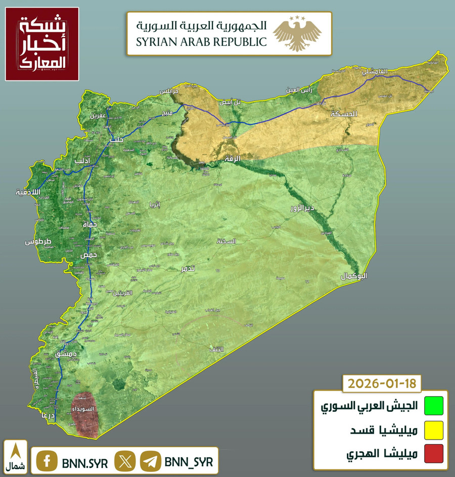 Bản đồ các vùng lãnh thổ do chính phủ kiểm soát ở Syria tính đến ngày 18 tháng 1 năm 2026. Màu xanh lá cây biểu thị các đơn vị ủng hộ chính phủ, màu vàng biểu thị các đơn vị người Kurd.