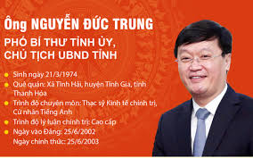 Ông Nguyễn Đức Trung sinh ngày 21/3/1974, quê quán xã Tĩnh Hải, huyện Tĩnh Gia, tỉnh Thanh Hóa; trình độ chuyên môn: Thạc sĩ kinh tế; trình độ lý luận chính trị: Cao cấp. Ông từng giữ các chức vụ như: Vụ trưởng Vụ Tổ chức cán bộ, Vụ trưởng Vụ Kinh tế địa phương và lãnh thổ, Vụ trưởng Vụ Kết cấu hạ tầng và đô thị thuộc Bộ Kế hoạch và Đầu tư. Từ tháng 1/2019 đến tháng 2/2020, ông giữ chức vụ Thứ trưởng Bộ Kế hoạch và Đầu tư. Từ tháng 3/2020 đến tháng 11/2024, ông giữ chức Bí thư Ban cán sự đảng, Chủ tịch UBND tỉnh Nghệ An.