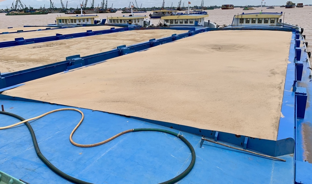 | Cát nhập khẩu từ Campuchia qua cửa khẩu quốc tế Thường Phước, phục vụ các dự án xây dựng. Ảnh: T.H |
