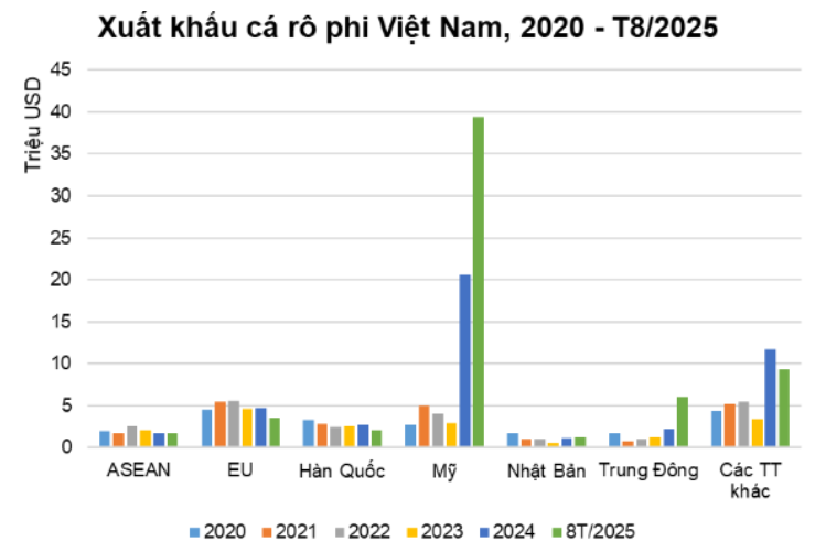 8 tháng năm 2025, cá rô phi chiếm ưu thế với 52 triệu USD, tăng “bứt phá” 359%; riêng thị trường Mỹ đóng góp tới 70% kim ngạch.