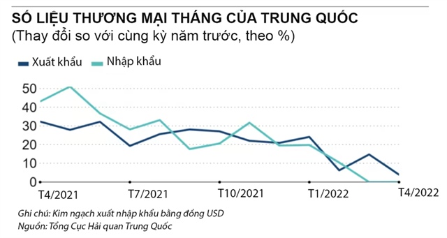 Nếu không tính mặt hàng xăng, kim ngạch nhập khẩu của Trung Quốc giảm 7% trong tháng 4 và giảm 3% trong tháng 3 so với cùng kỳ năm 2021. Nhập khẩu nguyên vật liệu sản xuất cũng giảm do hoạt động hậu cần bị gián đoạn. Tương tự, nhập khẩu mỹ phẩm và đồ dùng hàng ngày cũng giảm. Các xu hướng này cho thấy nhu cầu nội địa suy yếu trong bối cảnh thị trường việc làm xấu đi tại Trung Quốc.
