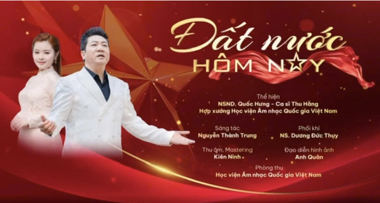 Trường ca “Đất nước hôm nay” của nhạc sĩ Nguyễn Thành Trung, MV ca nhạc do NSND Quốc Hưng, ca sĩ Thu Hằng cùng Hợp xướng Học viện Âm nhạc quốc gia Hà Nội thể hiện; nhạc sĩ Dương Đức Thụy phối khí, được xây dựng như một chỉnh thể nghệ thuật theo tư duy trường ca, đại hợp xướng thế tục hiện đại.