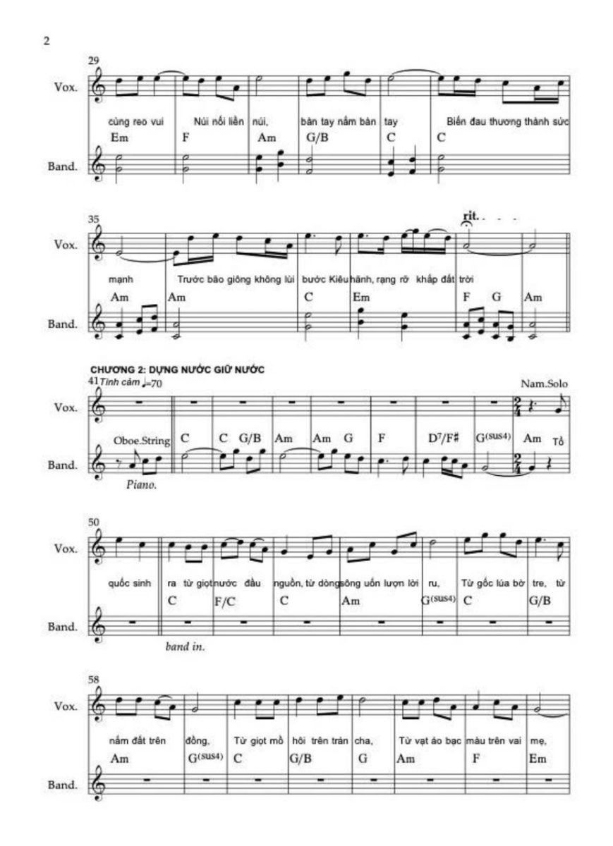Chương II chuyển sang nhịp 2/4, giọng Đô trưởng. Nội dung ca từ bắt đầu từ những yếu tố đời thường (nước, lúa, tre, cha mẹ) rồi mở ra chiều dài “bốn ngàn năm dựng nước”.