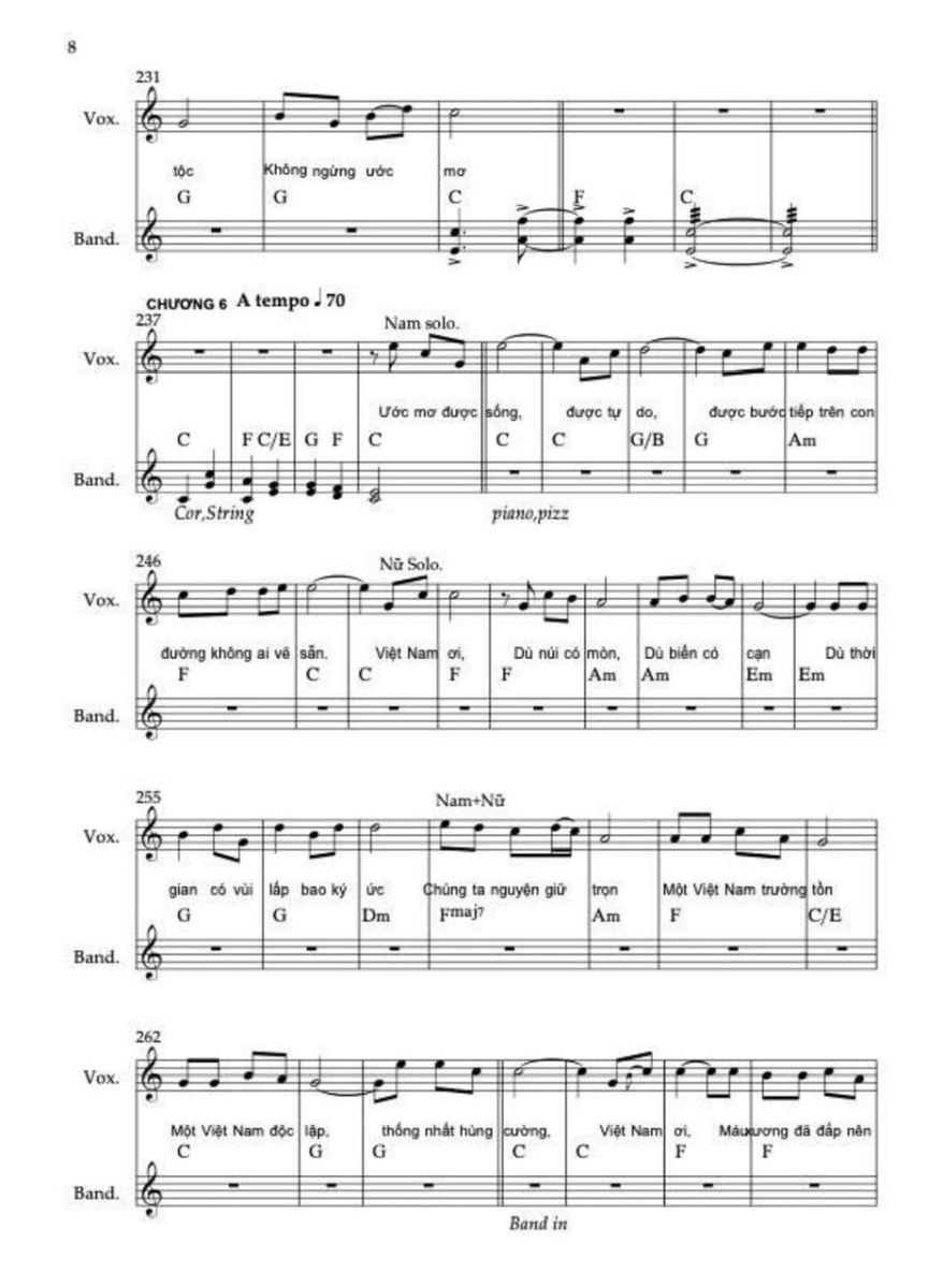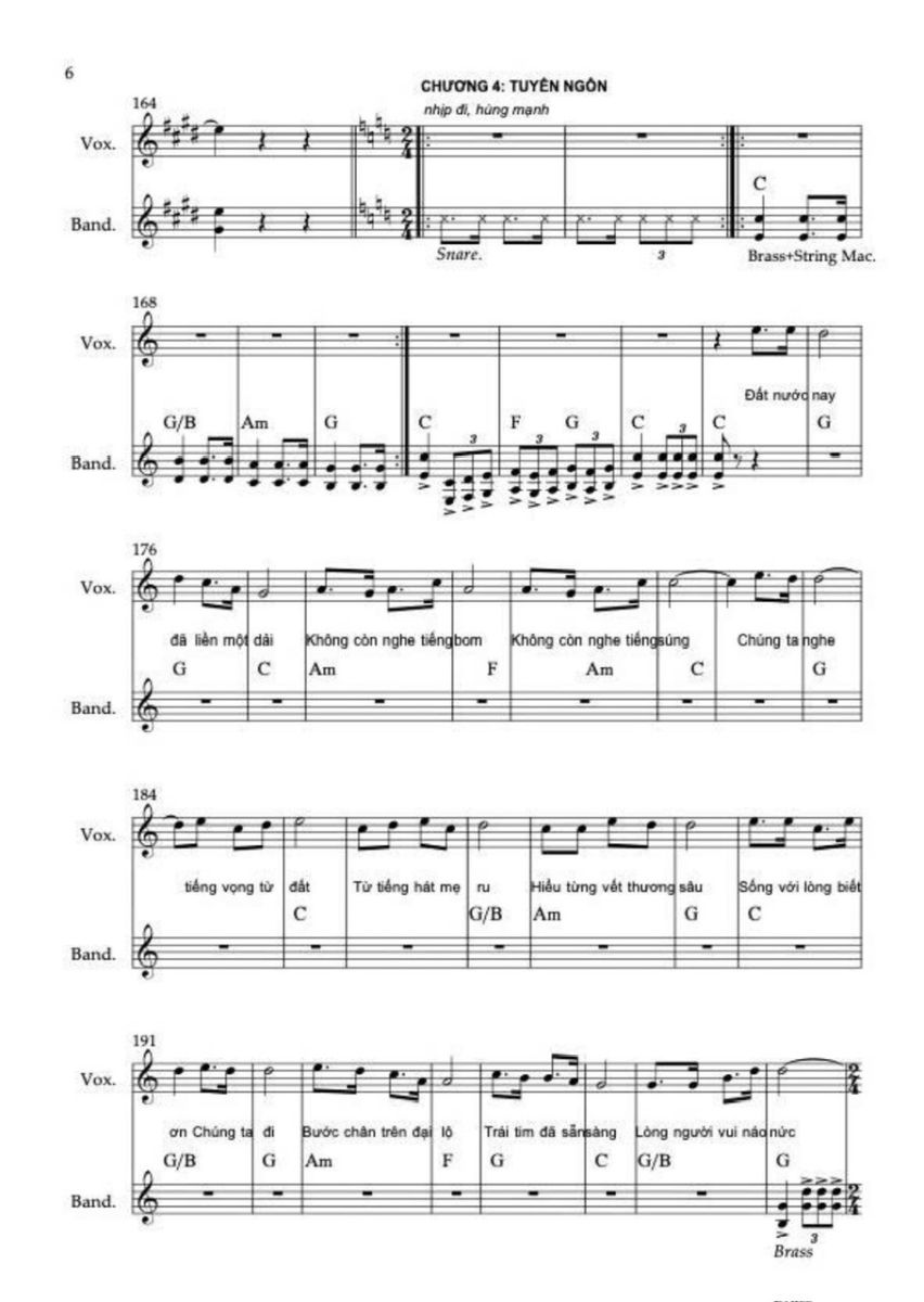 Chương VI trở về nhịp 4/4, giọng Đô trưởng, thánh ca. Khác với Chương V, mô-típ chuỗi âm bị loại bỏ hoàn toàn. Âm nhạc khóa chặt vào chủ âm, vì lời thề không thể “đi”, mà phải “đứng”. Điểm tinh tế duy nhất của chuyển động nằm ở cụm “ước mơ được sống”, nơi giai điệu chạm nhẹ sang bậc kề (2 hoặc 3) rồi lập tức quay về I. Đây là nhịp thở con người bên trong lời thề bất biến. Kết thúc bằng “Việt Nam muôn năm”, âm nhạc hoàn toàn bất động về mặt chức năng, tạo cảm giác niềm tin đứng vững.