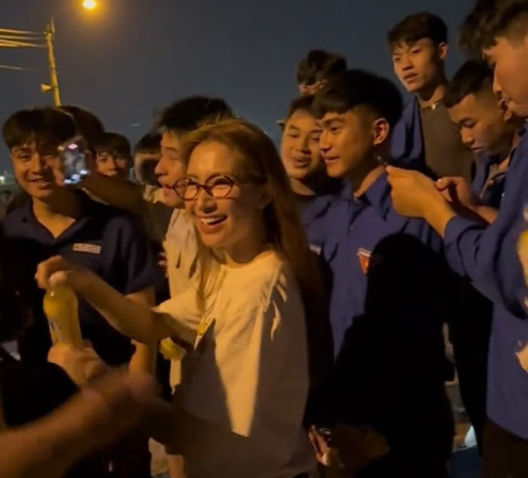 Nữ ca sĩ không quản ngại khó khăn, đội mưa gió cùng đội ngũ tình nguyện viên phát nước và thực phẩm tận tay cho bà con và các lực lượng chức năng đang làm nhiệm vụ đắp đê.
