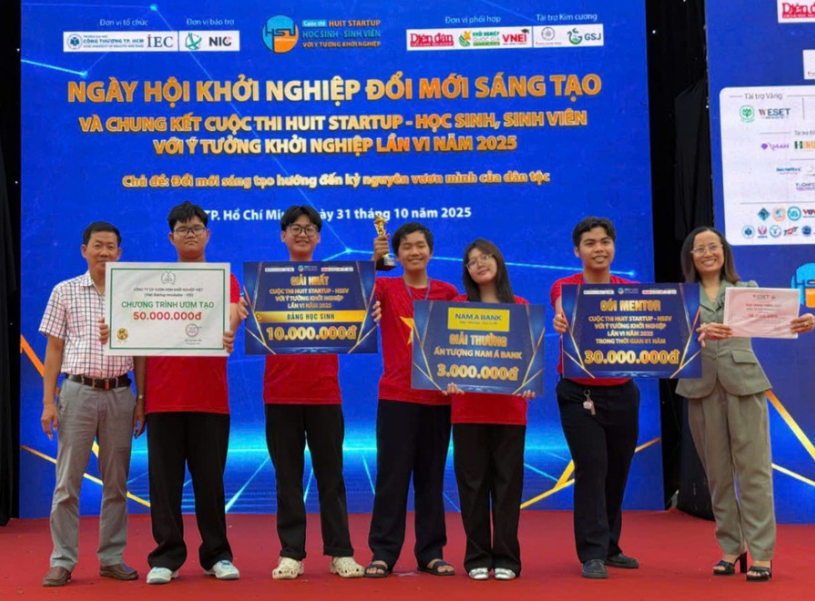 Nhóm học sinh An Giang đạt giải Nhất tại Cuộc thi HUIT Startup năm 2025.