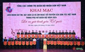 Sáng 29/10, tại Hà Nội, Tổng cục Chính trị Quân đội nhân dân Việt Nam tổ chức khai mạc Liên hoan hát ru, hát dân ca và âm nhạc cổ truyền của dân tộc Việt Nam trong phụ nữ Quân đội năm 2024, với chủ đề "Lời ru giữ bình yên Tổ quốc".