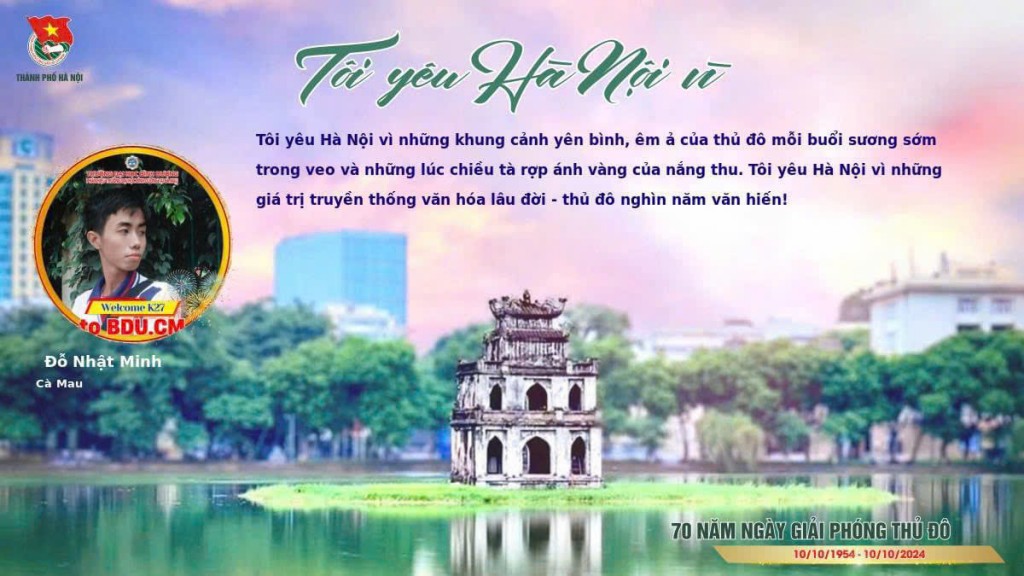 Bày tỏ tình yêu với Thủ đô, anh Bùi Duy Khanh, Bí thư Đoàn - Chủ tịch Hội Liên hiệp Thanh niên phường Hoàng Liệt chia sẻ: “Hà Nội là nơi tôi sinh ra, lớn lên, là nơi tôi được học tập, rèn luyện và trưởng thành. Tôi rất tự hào là người con của Thủ đô. Là một Thủ đô của lương tri và phẩm giá của con người, bộ mặt của quốc gia, trái tim của cả nước, thành phố vì hòa bình”.