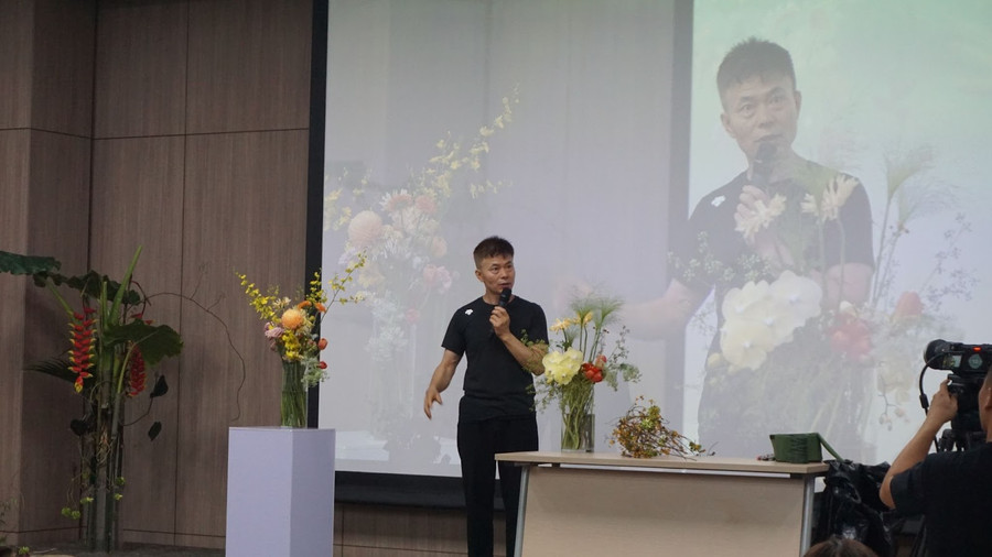 Ông Oh Myeon - một khách mời từ Hàn Quốc “thị phạm” thực hiện tác phẩm nghệ thuật từ hoa tươi cho khán giả tại triển lãm.
