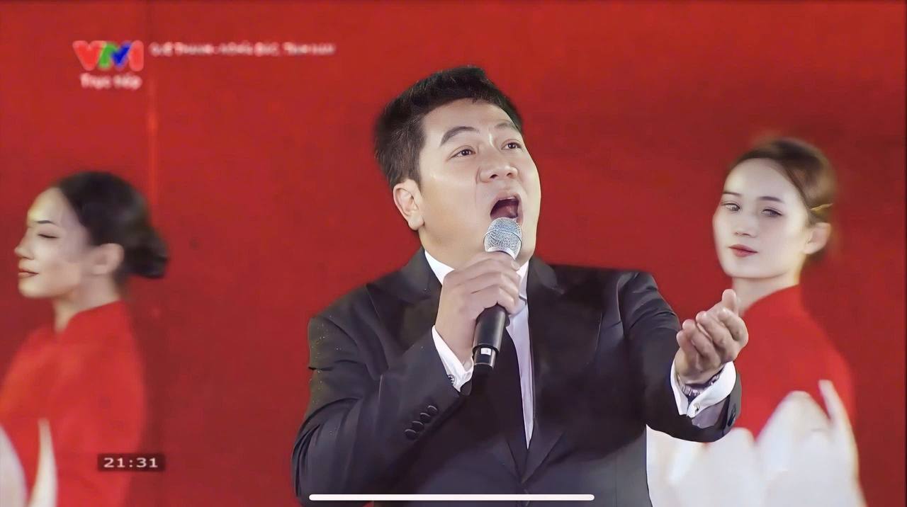 NSND Quốc Hưng (bên phải) và NSND Tạ Minh Tâm hòa giọng mashup hai ca khúc "Đất nước trọn niềm vui" và "Màu hoa đỏ" trong Lễ kỷ niệm, diễu binh, diễu hành 50 năm Ngày giải phóng miền Nam, thống nhất đất nước sáng ngày 30/4/2025.