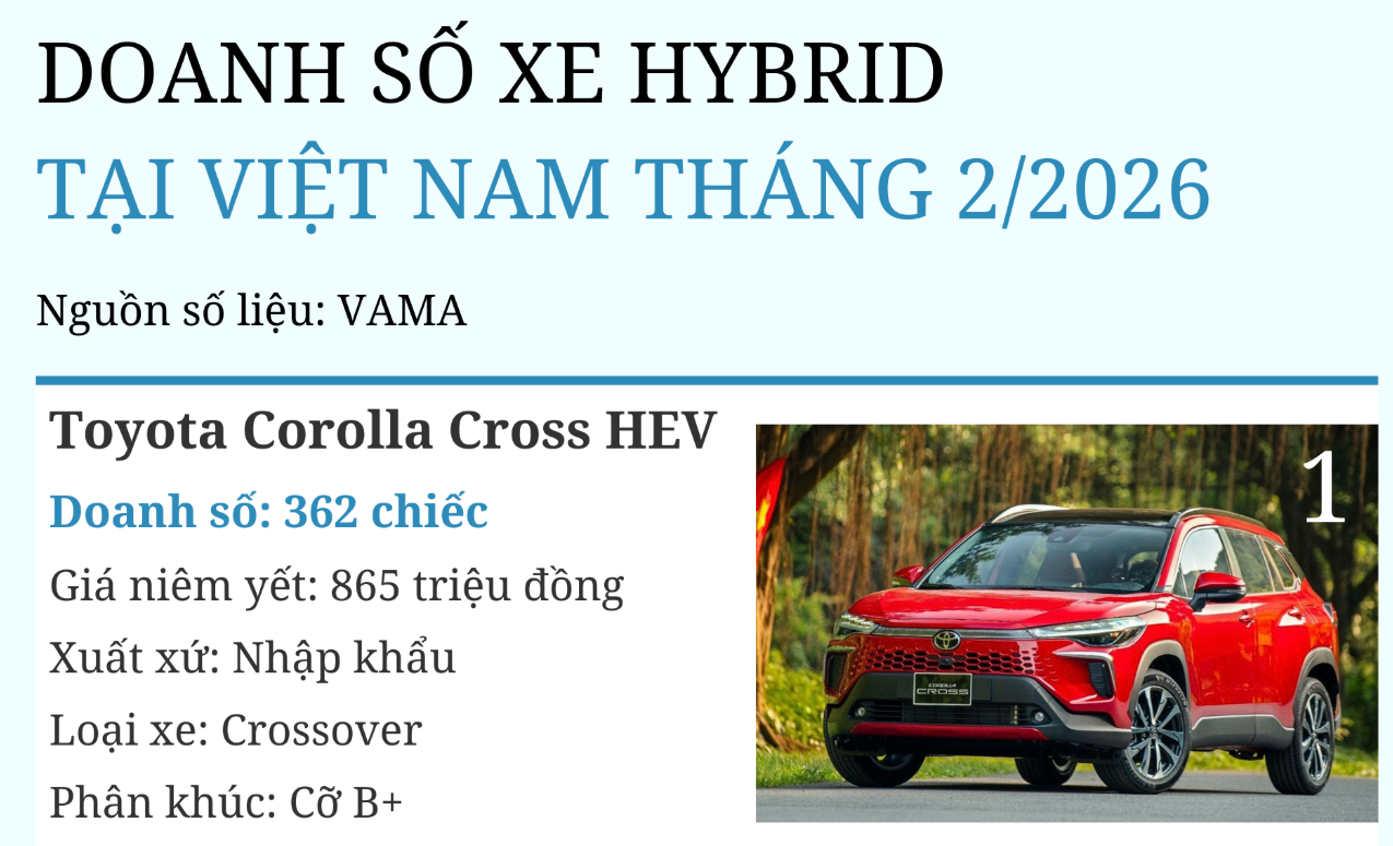 Doanh số các mẫu xe hybrid tại Việt Nam tháng 2/2026